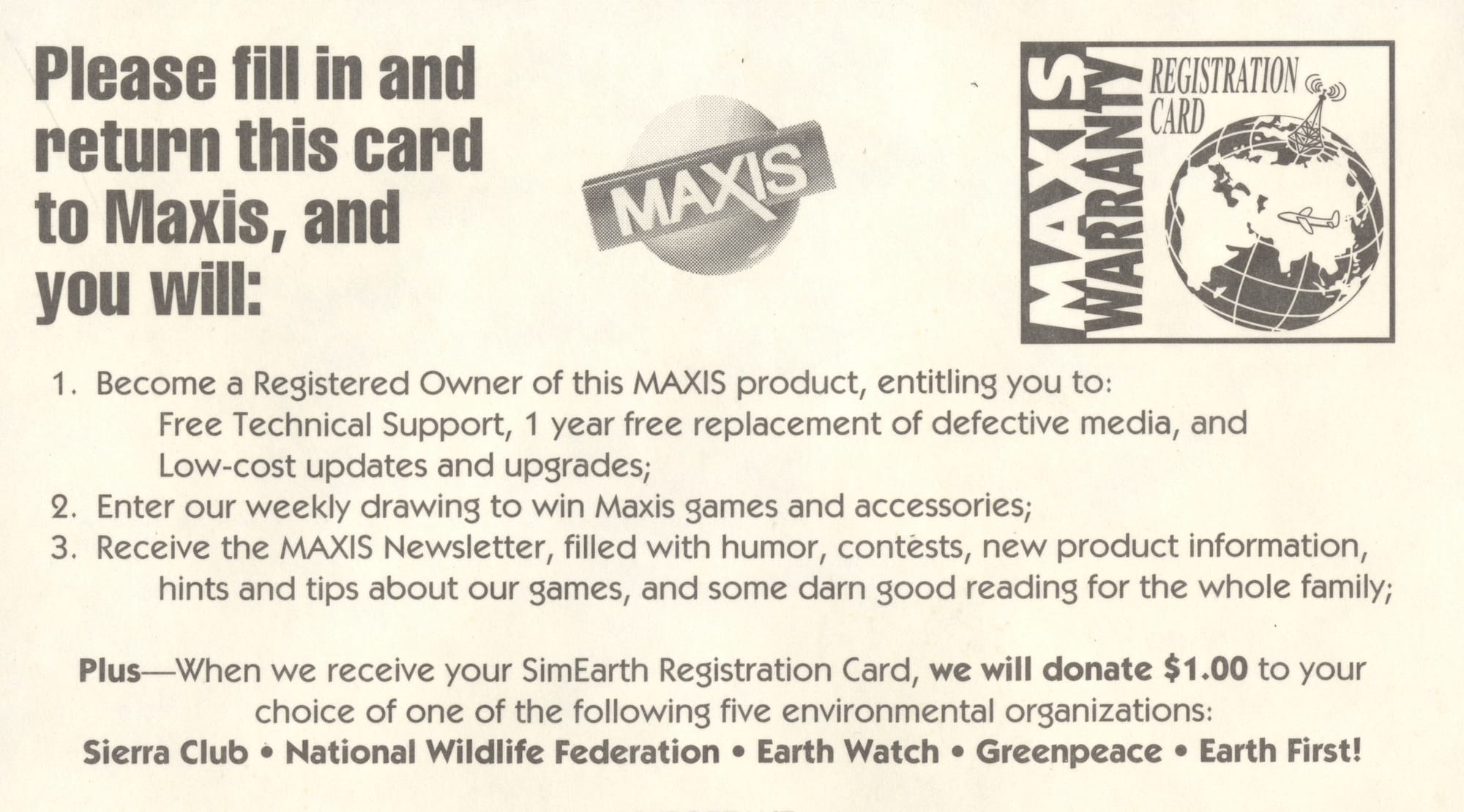 Wright was also interested in supporting organizations he felt aligned with. As game designer Chaim Gingold notes in his book Building SimCity, Maxis supported Lovelock's work by contributing royalties to his charity. Early versions of SimEarth even included registration cards that encouraged players to select an environmental organization for Maxis to donate $1 to on their behalf.