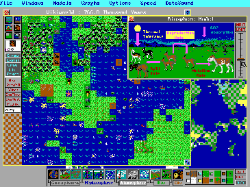 The game simulates the evolution of a rocky planet with geologic activity, weather systems, and oceans. As the planet's non-living systems evolve, so do its life forms, which start as single-celled prokaryotes but can eventually become sapient animals capable of launching nukes or blasting off into space. The planet's living and non-living systems interact: The spread of plant biomes, for instance, releases oxygen into the atmosphere while drawing down carbon dioxide; if too much carbon is sucked down, plant growth is inhibited and the biomes contract. As CO2-consuming plant life declines, carbon builds up in the atmosphere once more. Eventually, the planet's biomes bounce back, illustrating the Gaian idea that life regulates the non-living environment.