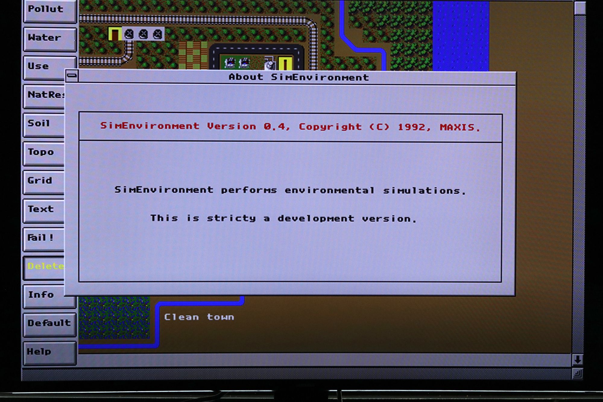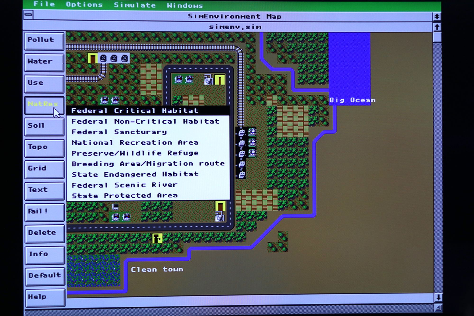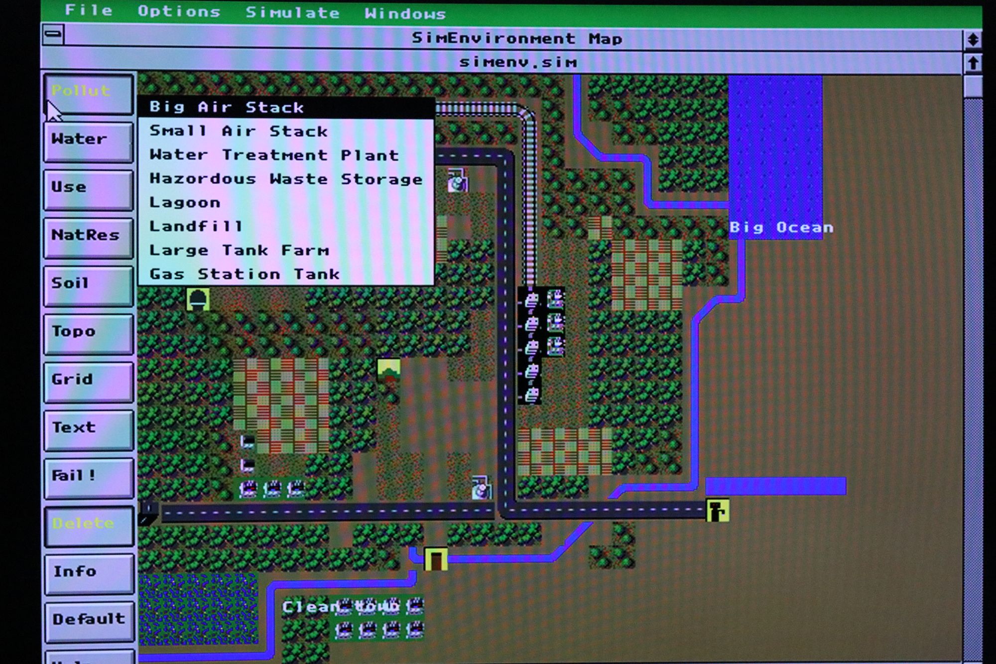 My investigation led to more questions than answers. The copy of SimEnvironment housed at the Strong Museum turned out to be an early prototype consisting of a tutorial, a world map that can be altered SimCity-style by adding roads, rivers, and polluting industrial sites, layers depicting soil conditions and topography, and a bunch of nonfunctional menu options. It's unclear if a more complete version of the game was ever built. Nobody I contacted for this article had more than a fleeting memory of the project or knew what became of it.