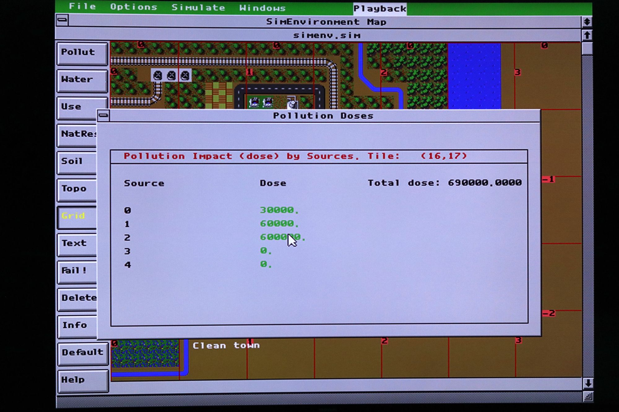 It seems that SimEnvironment's developers intended for the game to produce actual hazard "scores" in addition to visually simulating the spread of pollution. But this capability was never implemented. In fact, the Strong Museum's prototype copy of SimEnvironment has extremely limited functionality. The most complete part is a tutorial that shows players how to alter some of the settings and place polluting sites on the map. The tutorial then runs a "pollution simulation" in which blue pixels (water pollution?) and gray pixels (air pollution?) spread across the world. After the simulation ends, a "pollution impact" window pops up, showing the player the "dose" of pollution created by each source.